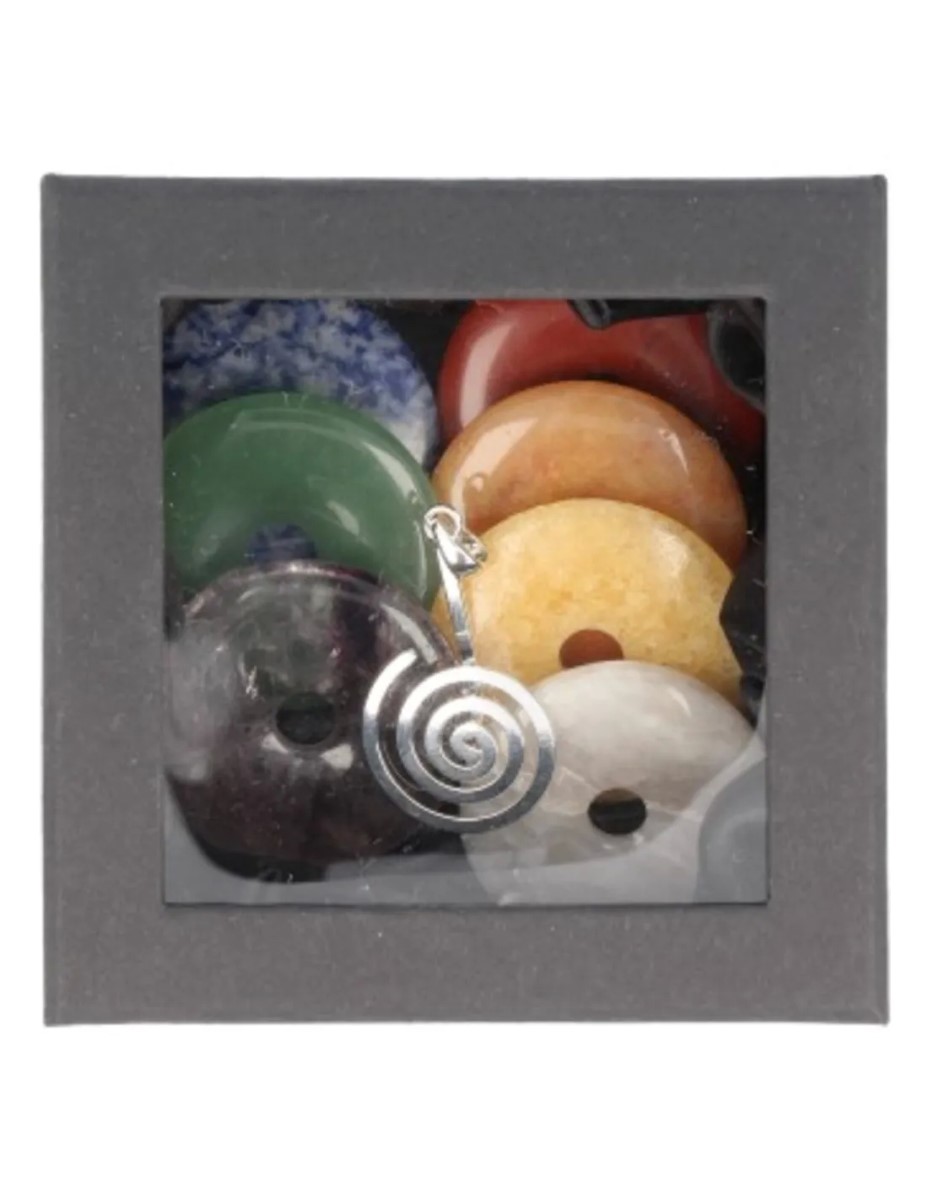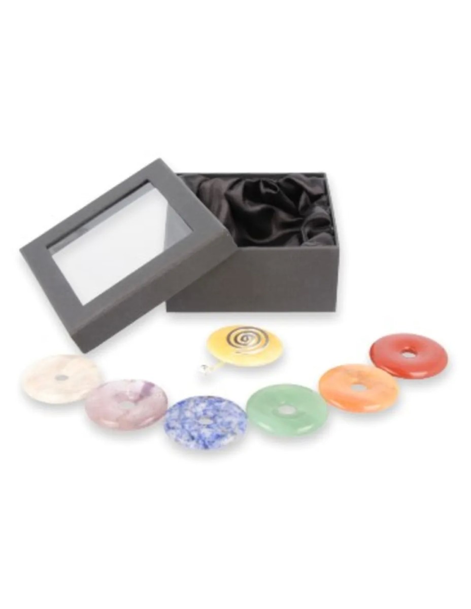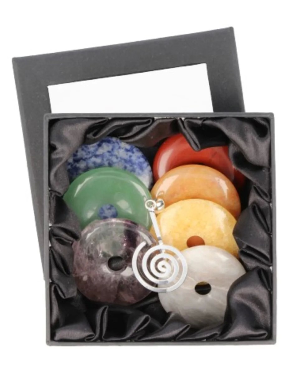 Chakra donut set, bevat 7 donuts in de chakra kleuren, inclusief een donuthanger! De soorten steen kunnen verschillen van de foto.