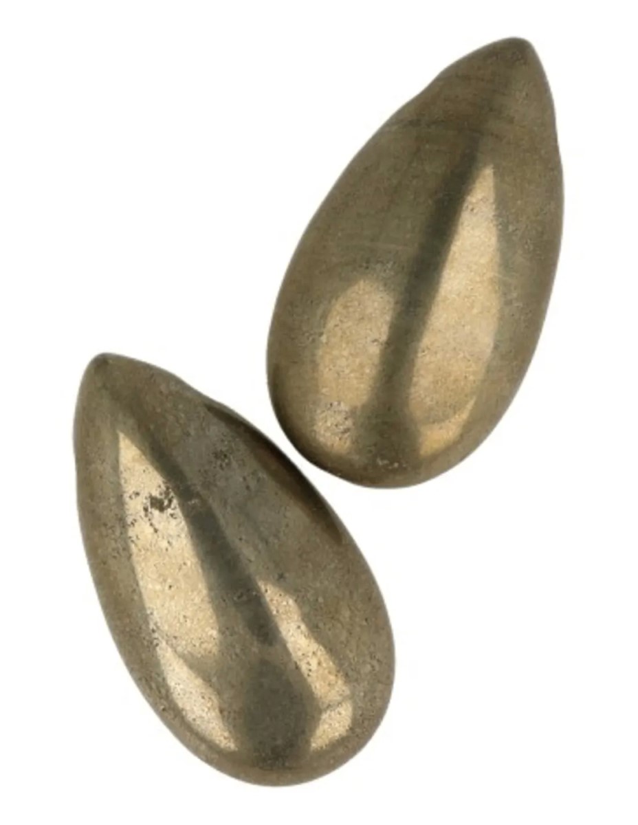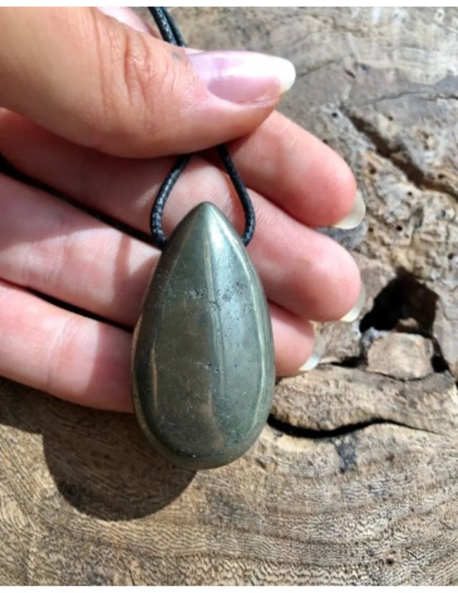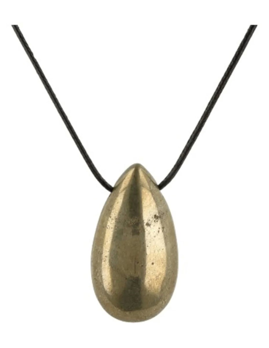 Edelsteen druppel hanger Pyriet van 4 cm lang. De hanger is doorboord bovenin, er past een 1 mm koord doorheen.