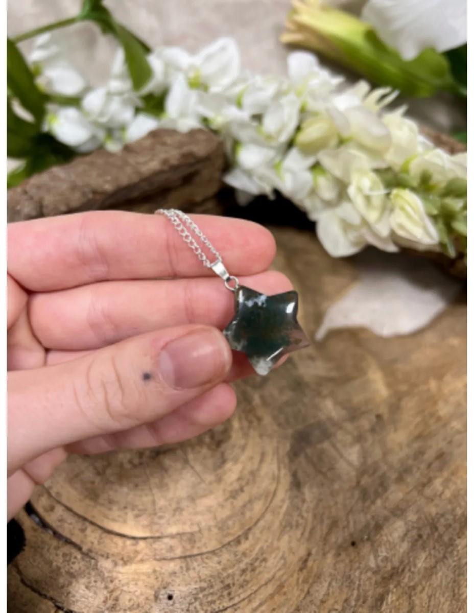 Een stervormige hanger met agaat mos is werkelijk een betoverend stukje natuur dat niet alleen visueel prachtig is, maar ook emotioneel diepgaand kan zijn. Verbondenheid met de natuur: Agaat mos is doordrenkt met de energie van de natuur. Het dragen van deze hanger kan je helpen om je op een dieper niveau te verbinden met de schoonheid en rust van de natuur. Het herinnert je aan de prachtige wereld om ons heen en kan een gevoel van verwondering en dankbaarheid opwekken. Groei en vernieuwing: De ‘mos’ in agaat mos kan symbool staan voor groei en vernieuwing. Het moedigt je aan om te groeien, zowel spiritueel als emotioneel. Het kan je helpen oude gewoonten los te laten en ruimte te maken voor nieuwe mogelijkheden in je leven.
