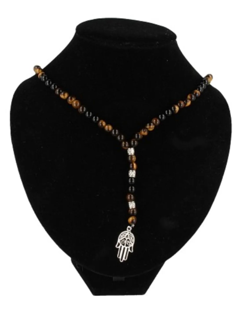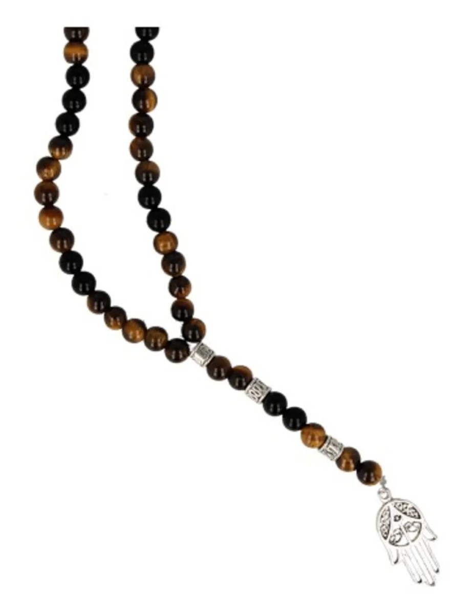 Stoere ketting van Tijgeroog en Onyx, het karabijnslotje is zilverkleurig. De ketting is 46 cm lang met kralen van 6 mm dik en een zilverkleurig ‘Hamsahandje’ als bedel. Het is een symbool voor geluk en bescherming.