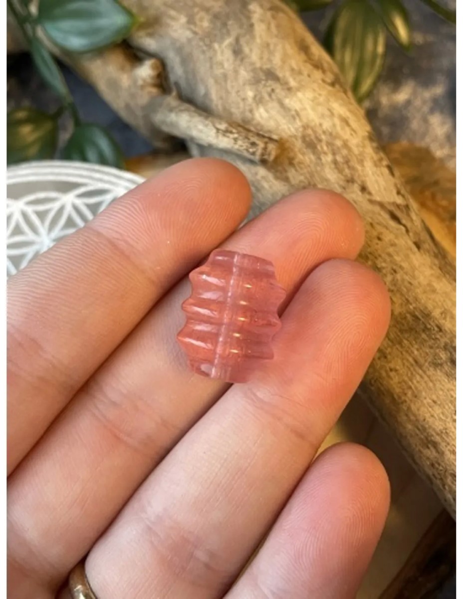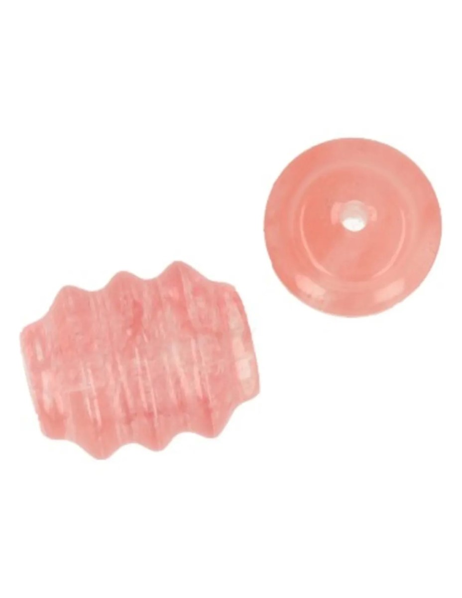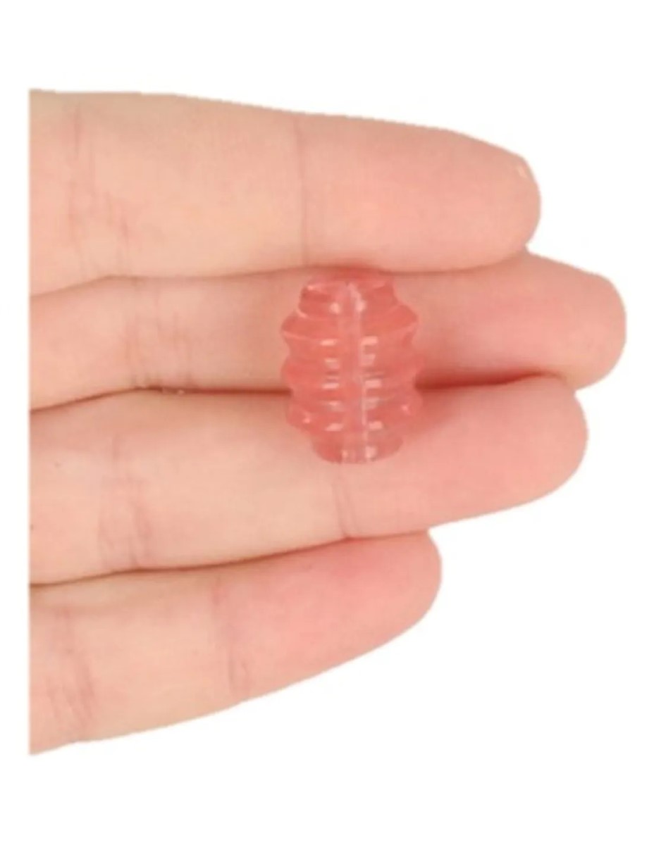Ribbel kraal van Aardbeikwarts. De kraal is 1,8 cm lang en 1,5 cm breed. De Aardbeikwarts kraal weegt ca. 4 gram. Let op! Deze losse kraal van Aardbeikwarts is synthetisch.