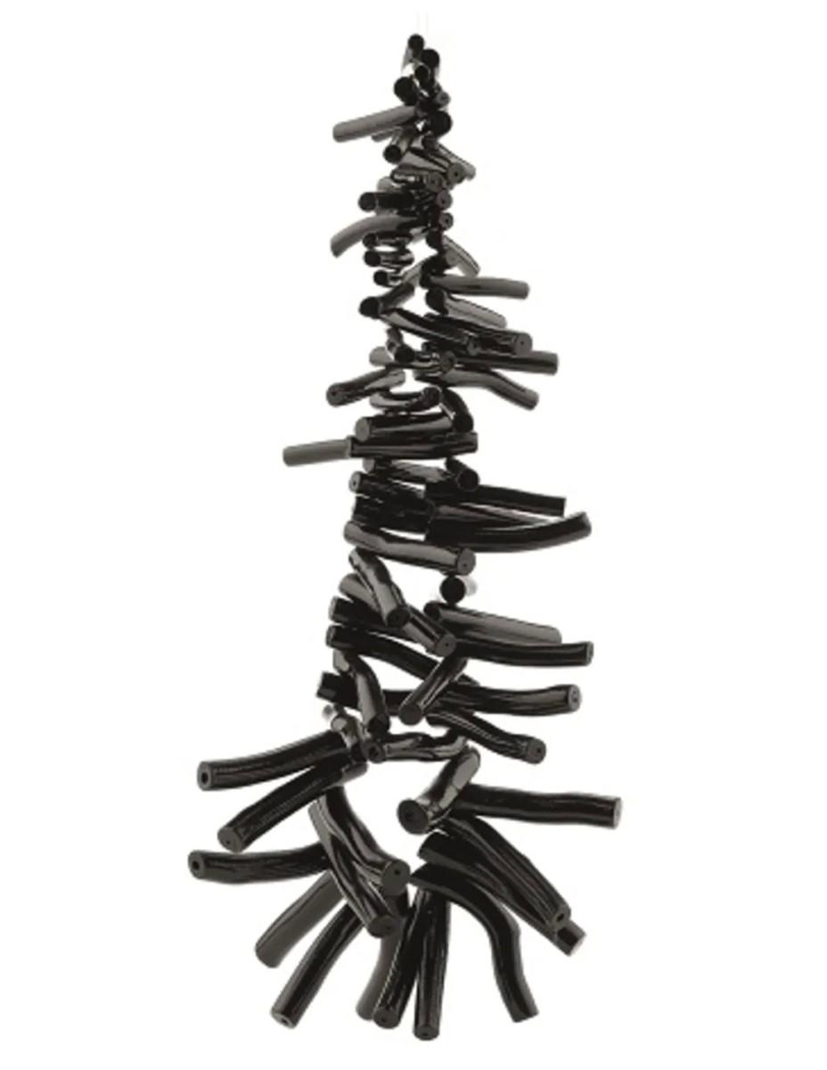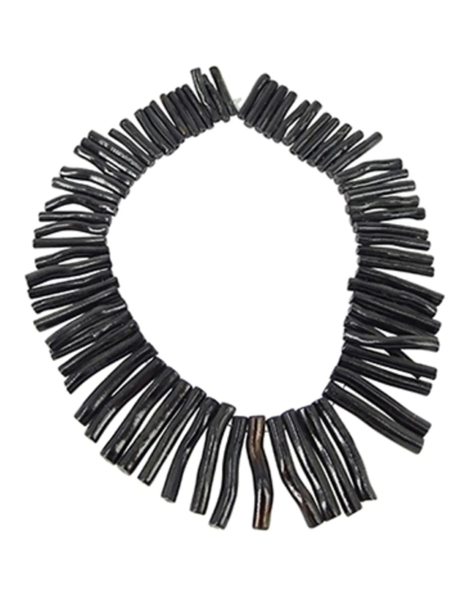 Streng koraal zwart met langwerpige kralen van 25 tot 40 mm lang. Bevat ca. 70 kralen.