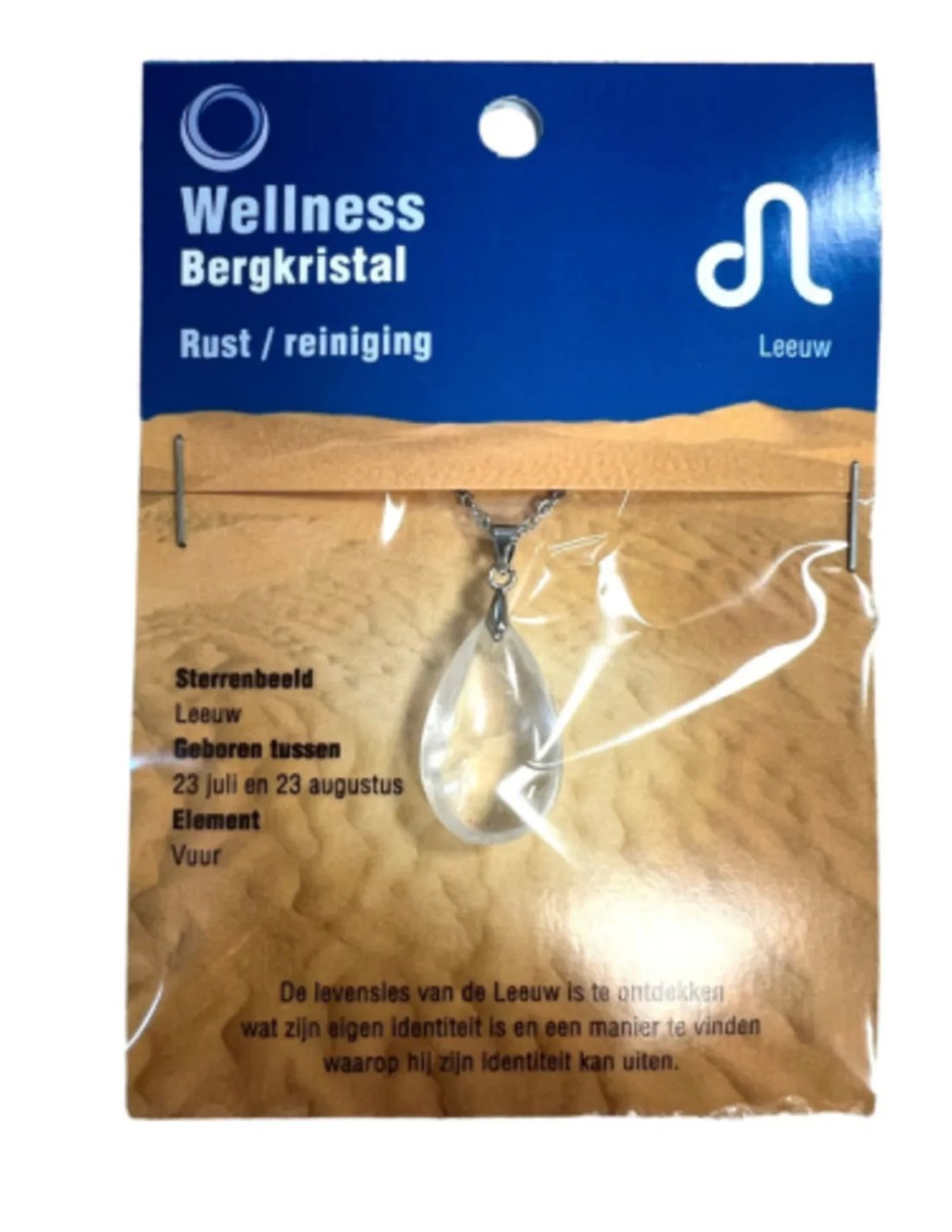 Bergkristal sterrenbeeldhanger, leeuw. Edelsteenhanger, op een displaykaartje met een rvs kettinkje.