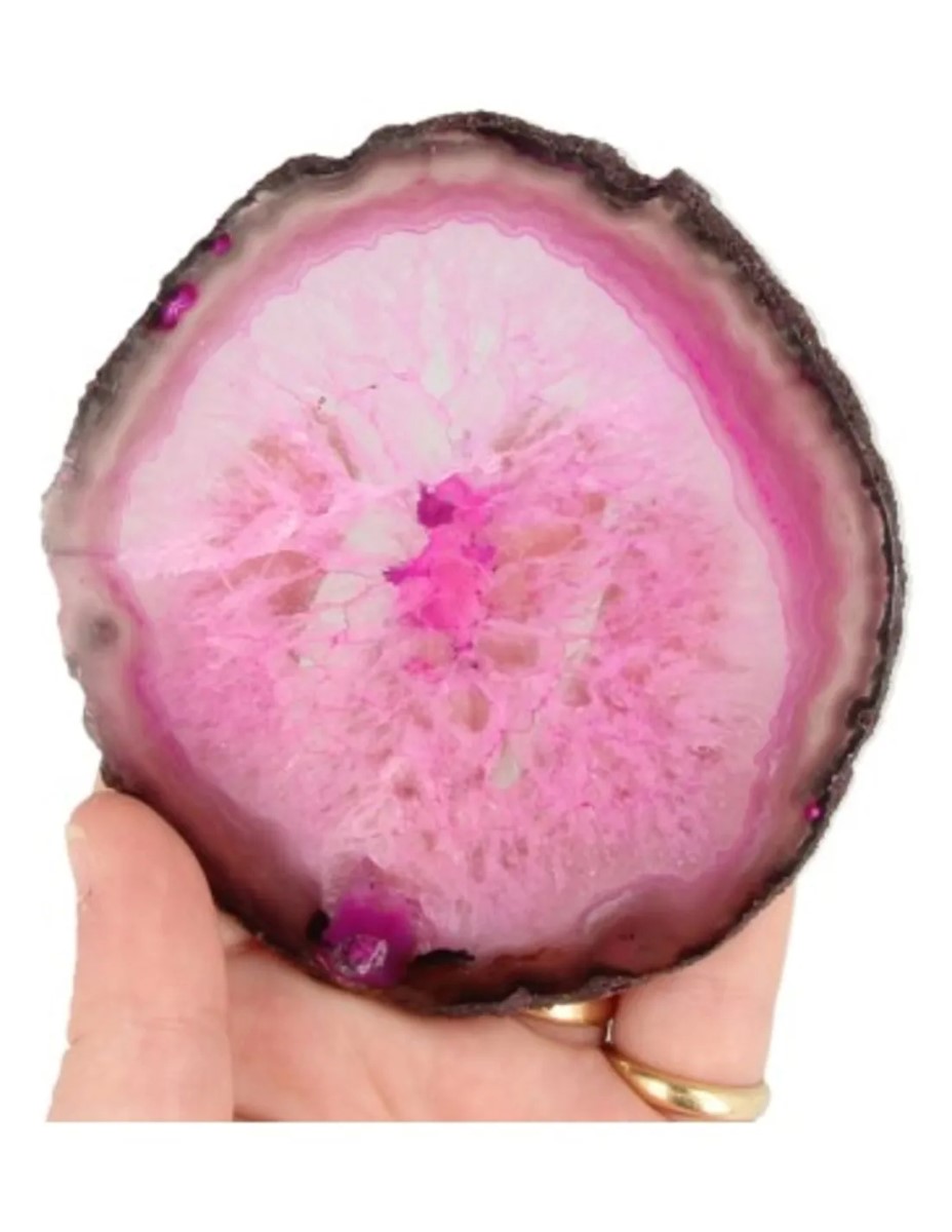 Set van 4 bijgekleurde Agaat onderzetters. De roze onderzetters hebben een doorsnede van 9 – 12 cm. De Agaat onderzetters zijn voorzien van rubberen dopjes aan de onderkant zodat tafels niet beschadigen. Let op! De kleuren kunnen afwijken van het te ontvangen product.