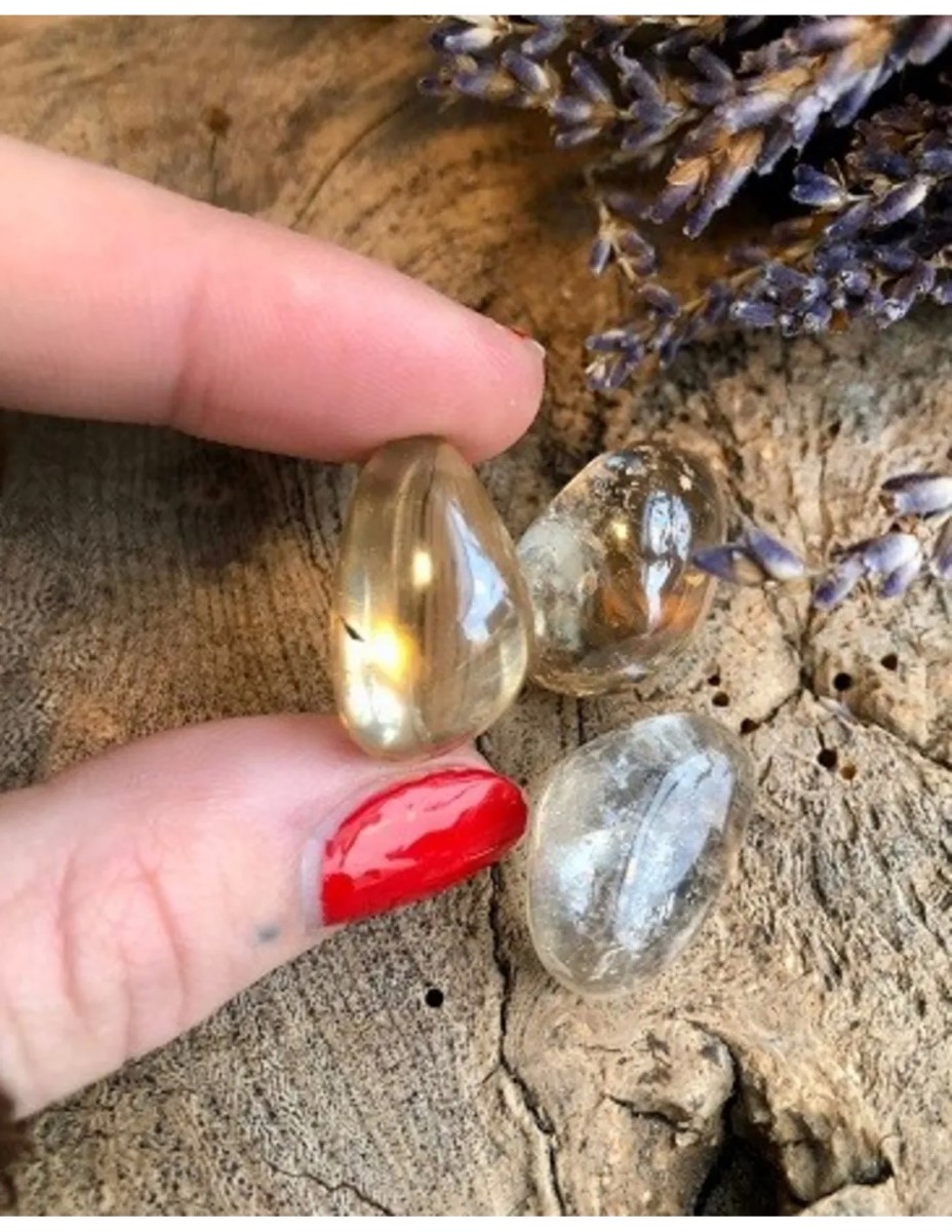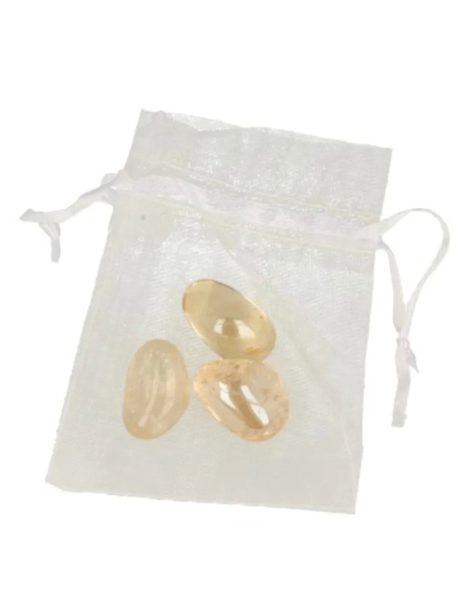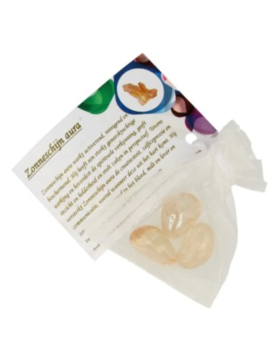 Giftzakje Zonneschijn Aura (gecoat), bevat 3 trommelsteentjes met informatie over de steen.