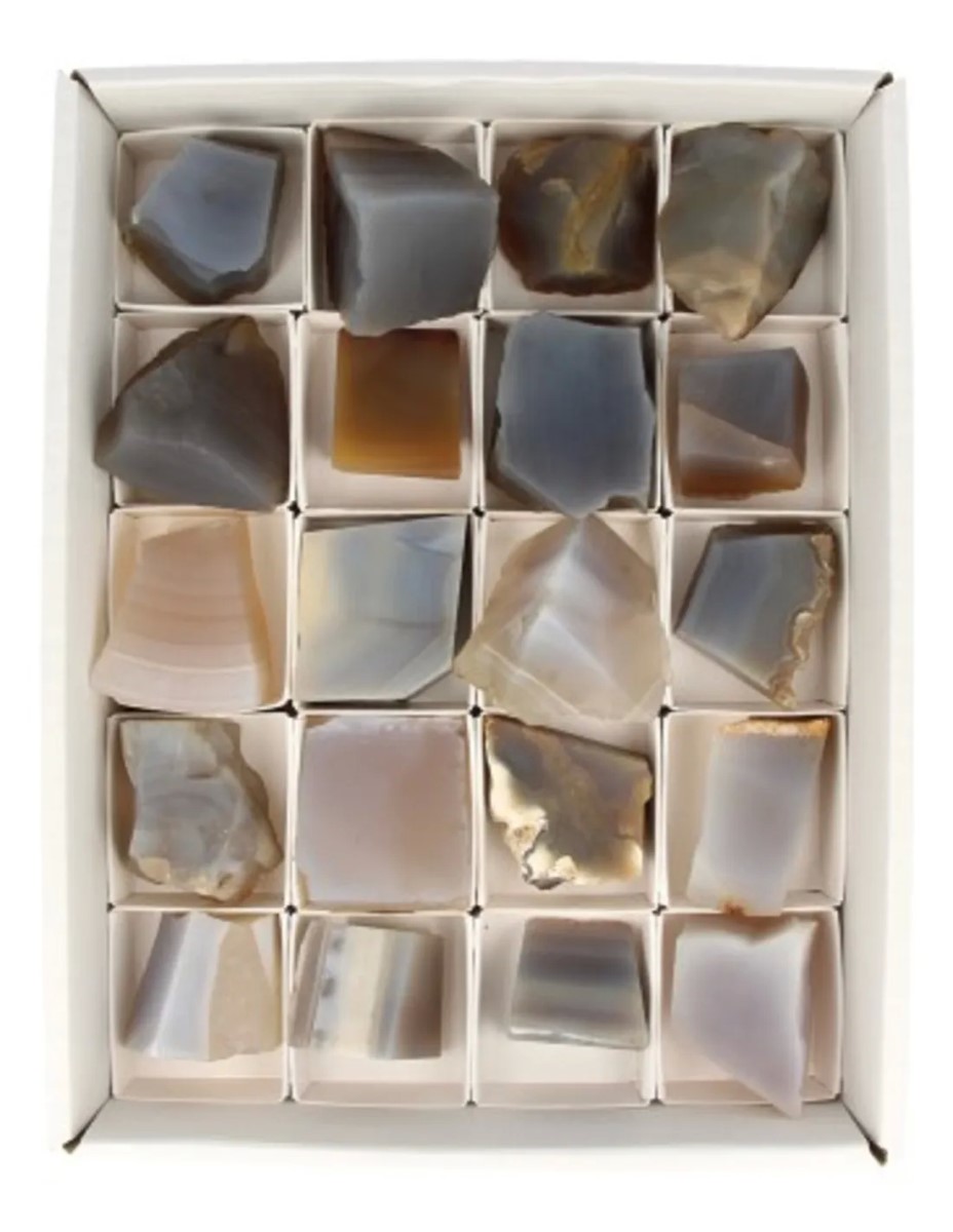 Verkoopdoos met daarin 20 kleinere doosjes met stukjes gesneden (natuurlijke) Agaat. De stukjes zijn ca. 4-5 cm in formaat.