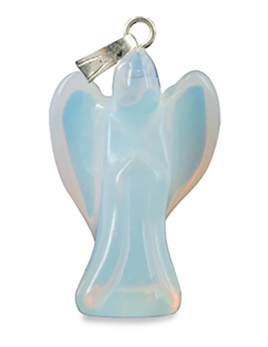 Een engelenhanger van de synthetische steen Opaliet, ideaal voor in je winkel of om cadeau te geven door de informatie op het kaartje. De engelenhanger is 20 mm lang.