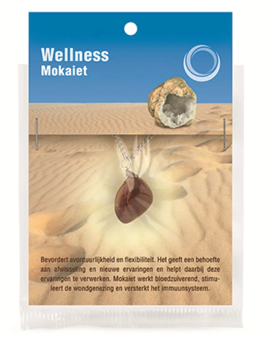Gezondheidshanger Mokaiet. Edelstenen hanger op een displaykaartje incl. RVS ankerschakel kettinkje