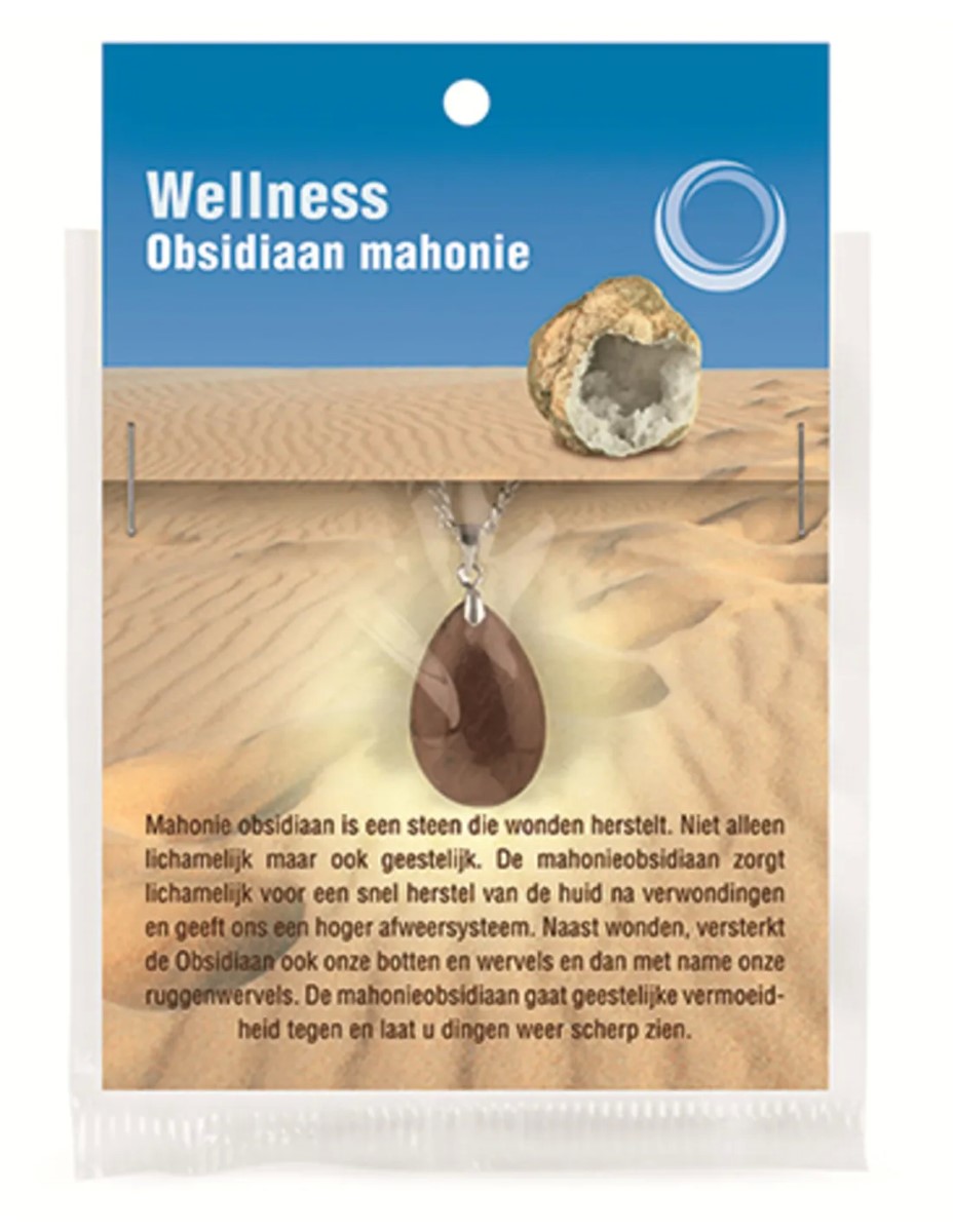 Gezondheidshanger Obsidiaan mahonie. Edelsteenhanger, op een displaykaartje incl. RVS ankerschakel kettinkje