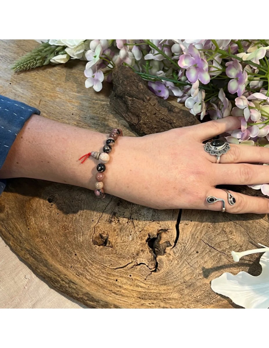 Rhodoniet powerbead armband met een displaykaartje met productinformatie en disclaimer.