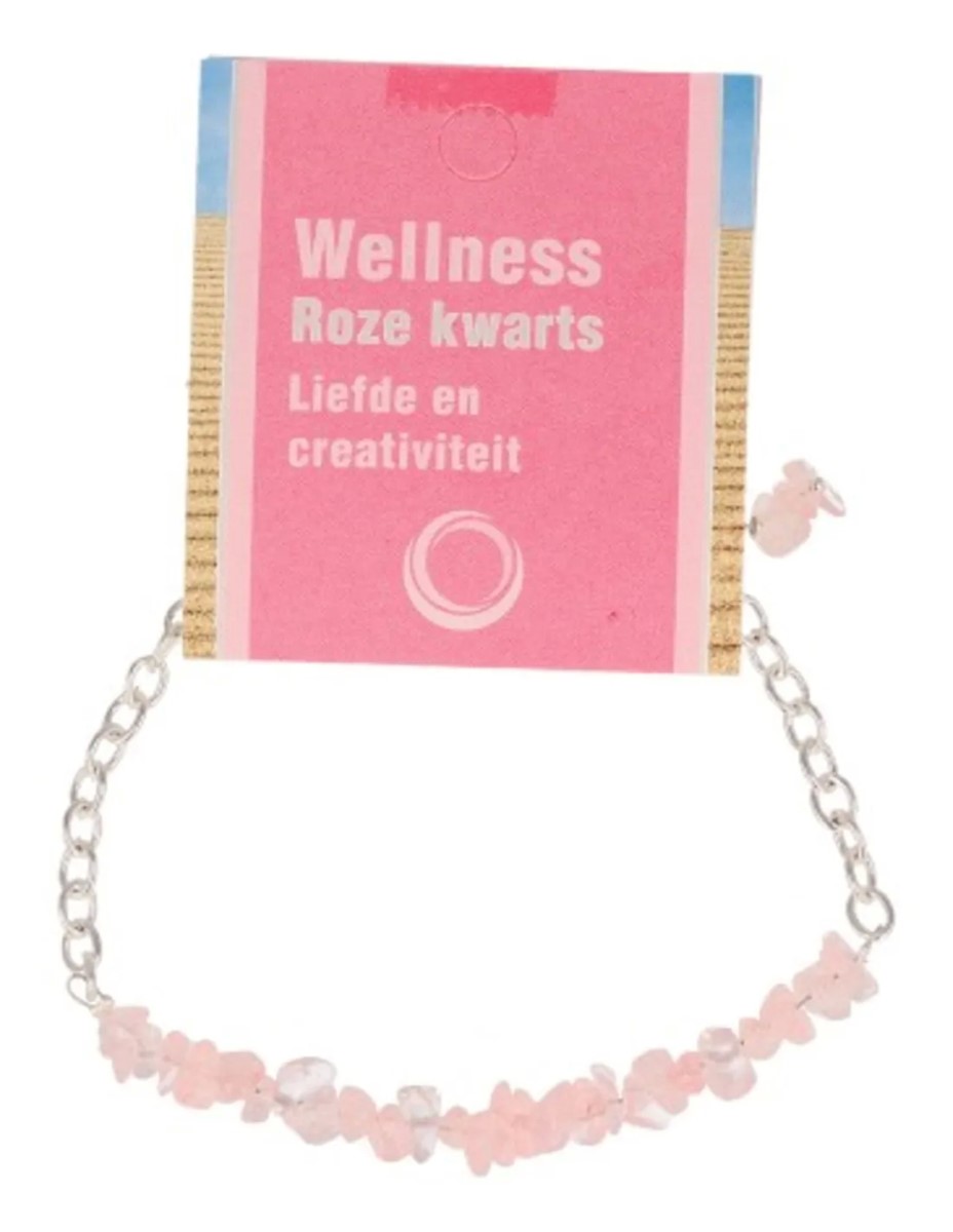 Bar armband op displaykaartje, met splitstenen van Roze kwarts, de rij edelstenen is ca. 7,5 cm en de armband is verstelbaar in maat. De armband is verzilverd en nikkelvrij.