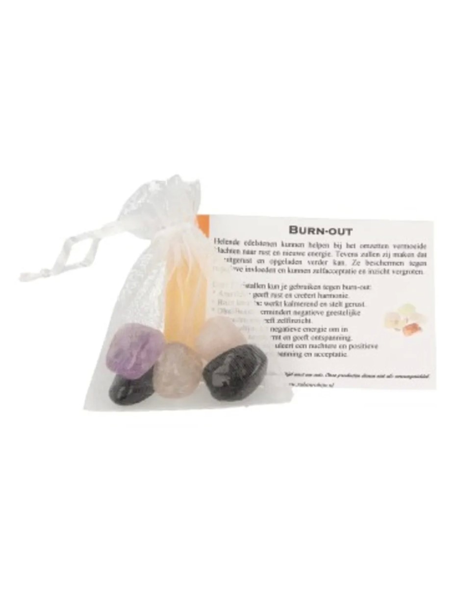 Burn-out edelsteen setje, bestaande uit Amethist, Roze kwarts, Obsidiaan, Rookkwarts en Toermalijn.