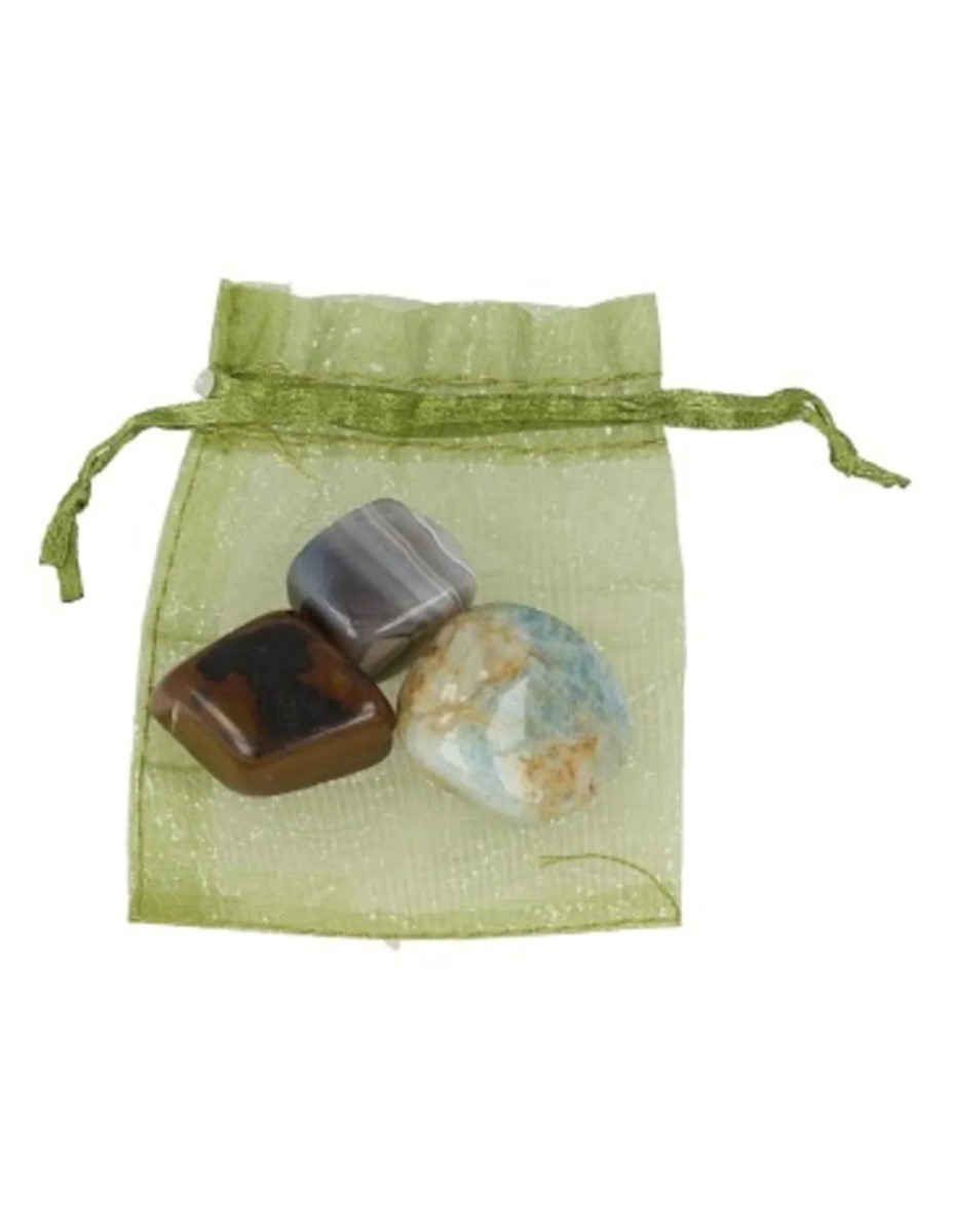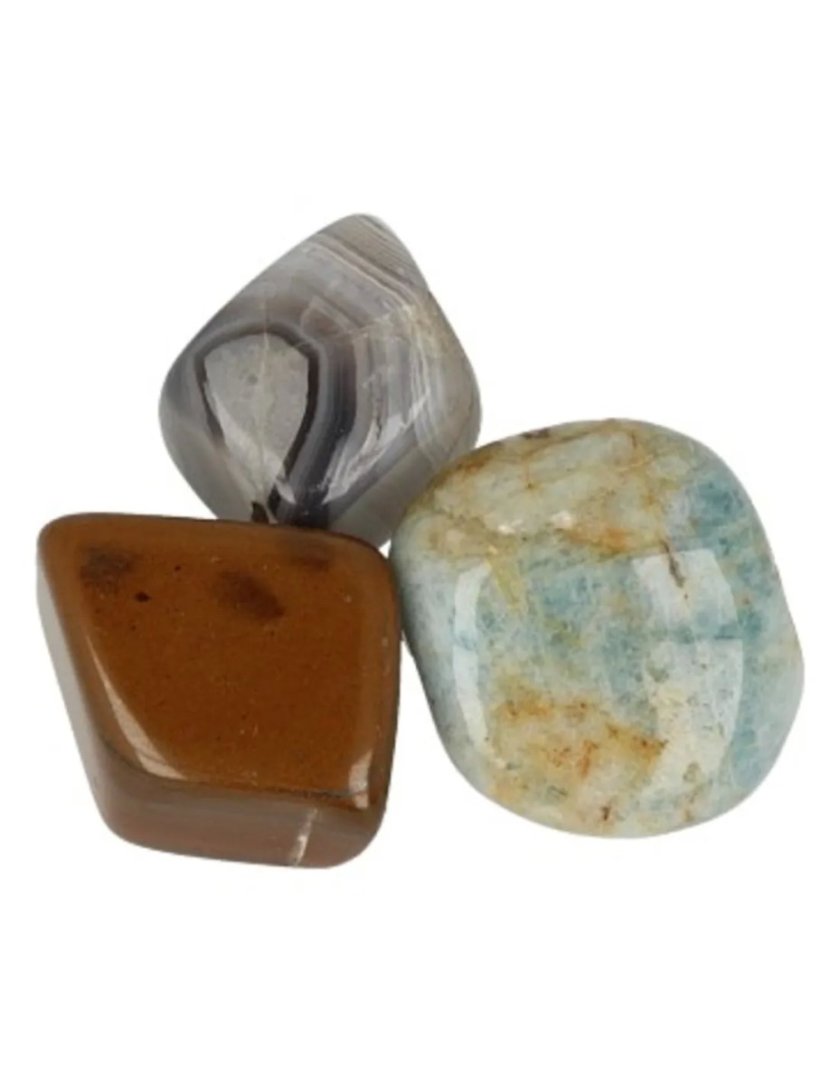 Succes edelstenen setje met daarin 3 trommelsteentjes zijnde Agaat, Aquamarijn en Tijgeroog en een handig kaartje met uitleg.