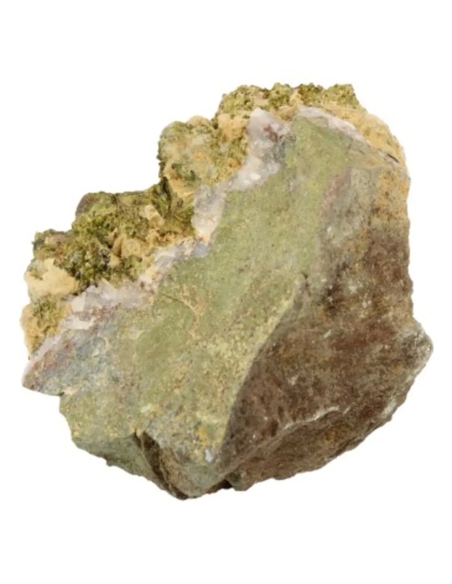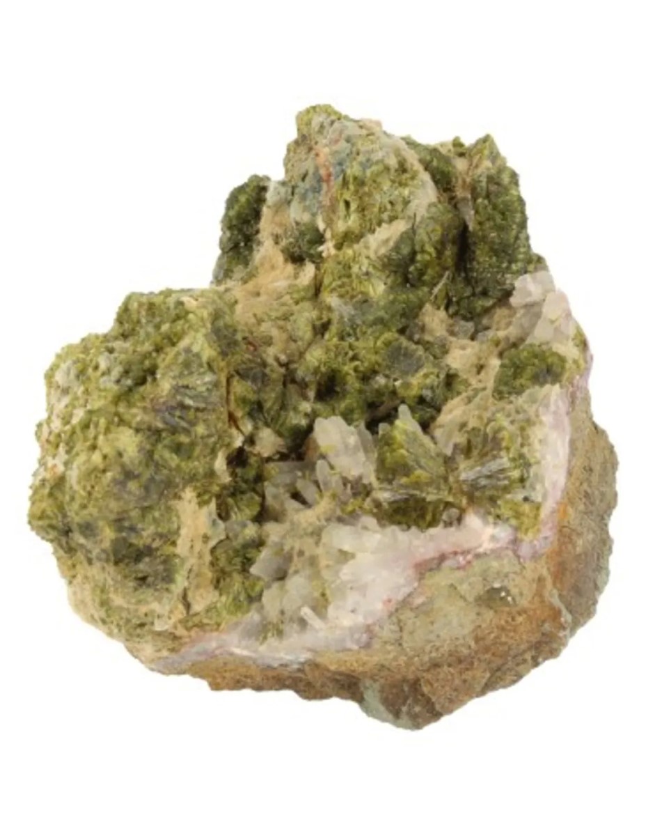 Stukje van de edelsteen Epidoot in A-kwaliteit en gekristalliseerd vorm. Dit stukje is 85 x 65 x 65 mm en het gewicht is 350 gram.