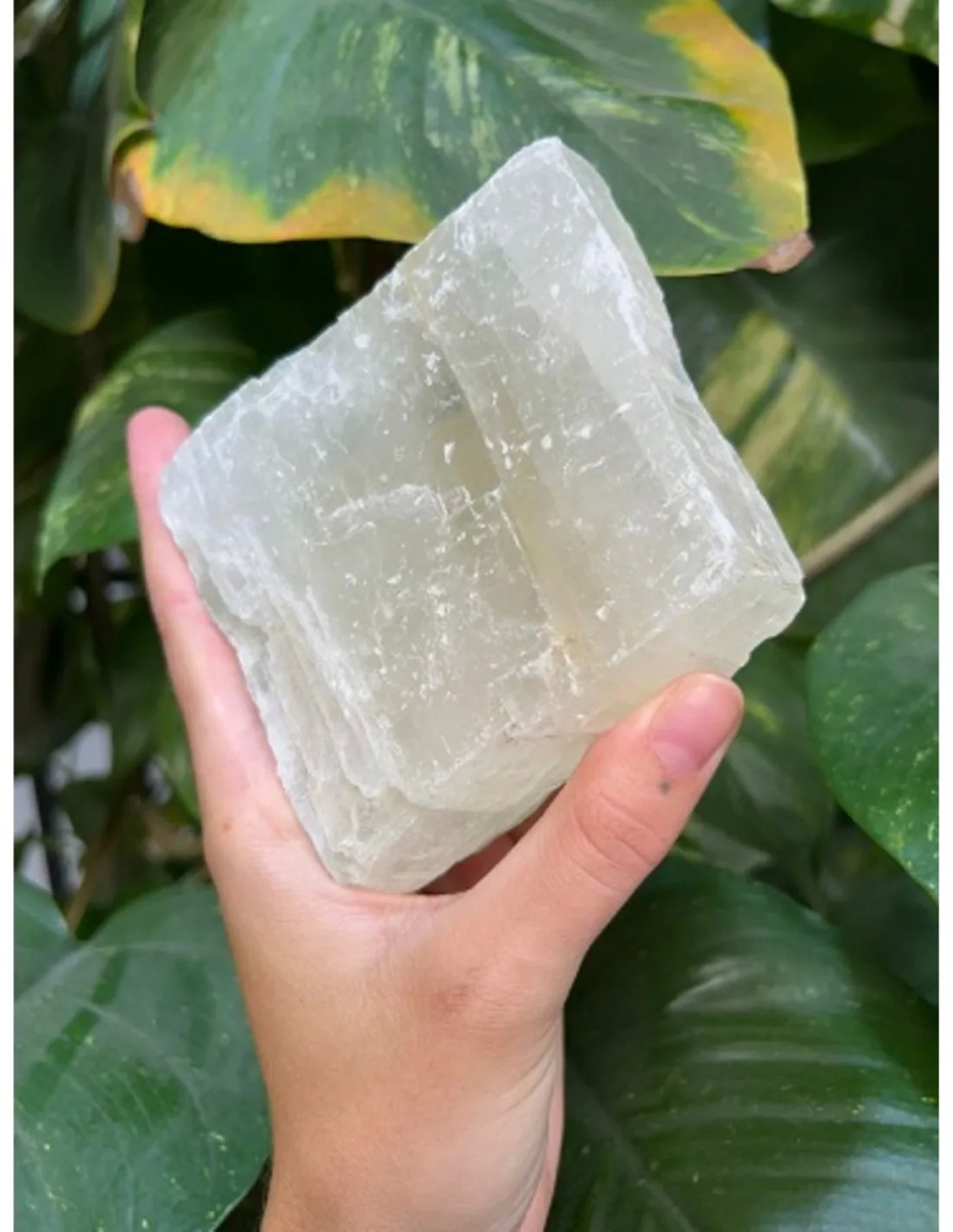 Ruw dubbelspaat stuk van Calciet groen. Het ruwe groene Calciet stuk weegt 500 tot 750 gram. Let op! Ieder stuk is uniek en kan daarom afwijken van de foto’s.