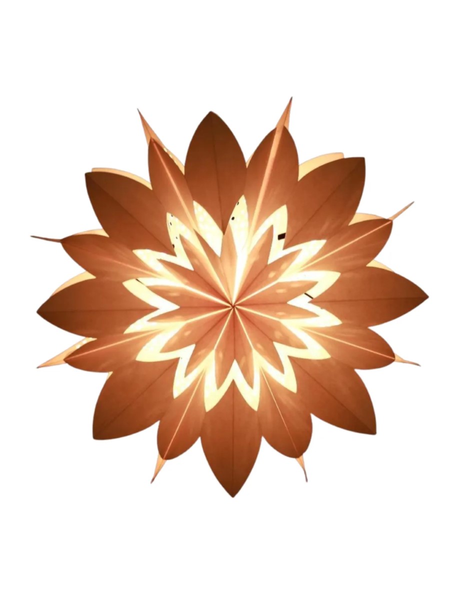 Deze bloemvorm kerstster is een onmisbare sfeerverhogende decoratie in elke huiskamer tijdens de kerst. Onverlicht is de papieren kerstster al prachtig, maar met verlichting komt de ster ’s avonds helemaal tot zijn recht. De kleuren en het patroon hebben dan een prachtige uitstraling. Daarnaast is de kerstster ook te gebruiken als een decoratief nachtlampje in een kinderkamer, maar ook op bruiloften, partijen en tuinfeesten draagt de kerstster bij aan een ultieme sfeer en uitstraling.