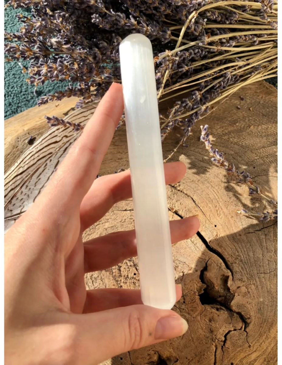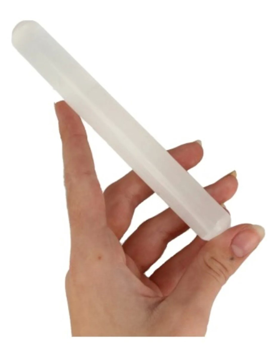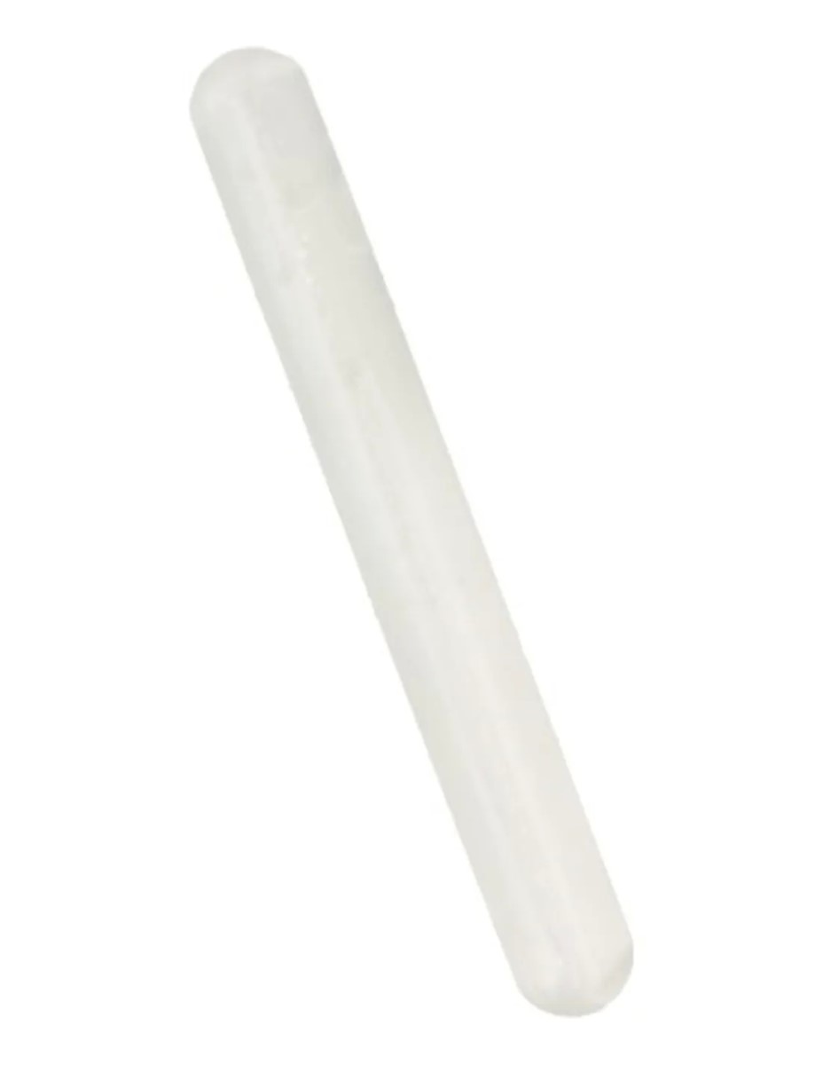 Massagestaaf van Seleniet met 2 ronde uiteinden. Ca. 15 cm lang en 1,5 tot 2 cm dik.