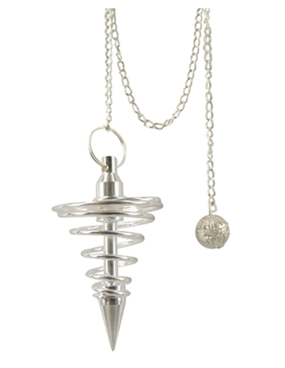 Messing pendel, spiraal zilverkleur, de pendel is 4 cm lang en wordt geleverd incusief kettinkje.