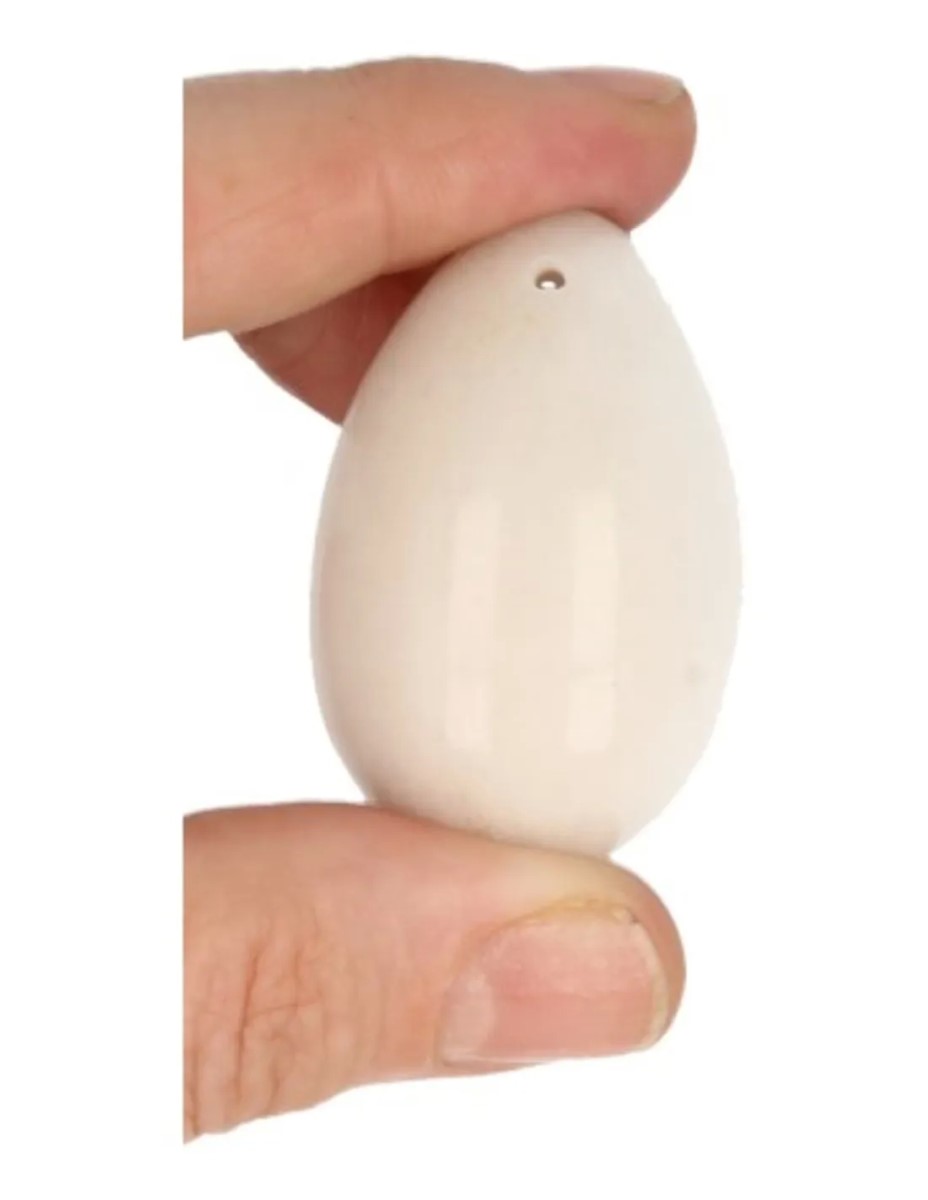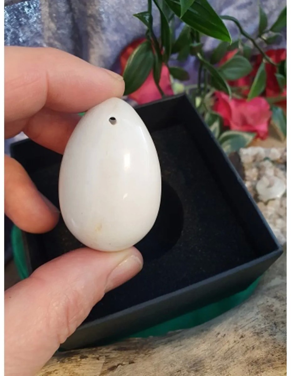 Yoni ei van sneeuwkwarts. Het wordt ook wel tantra ei of energie-ei genoemd. Het ei is van links naar rechts in de top geboord met een boorgat van ca. 1,5 mm. De sneeuwkwarts yoni ei weegt ca. 100 gram. Het formaat is 45×30 mm en wordt geleverd in een handig doosje.